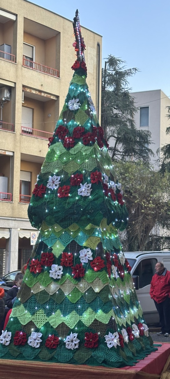 Sono diversi i bambini con genitori e nonni che nel pomeriggio hanno fatto capolino nella piazzetta di via Alcide De Gasperi. Tra una fetta di panettone e pandoro ed un bicchiere di tè, è partito il countdown di accensione delle luci che hanno così portato all’illuminazione dell’albero. Albero che è stato realizzato dalla Banca del Tempo lo scorso anno con un restyling di un’installazione costruita circa una decina d’anni fa. I volontari della Banca del Tempo hanno poi realizzato a mano all’uncinetto delle patch verdi posizionate tutte intorno alla costruzione.