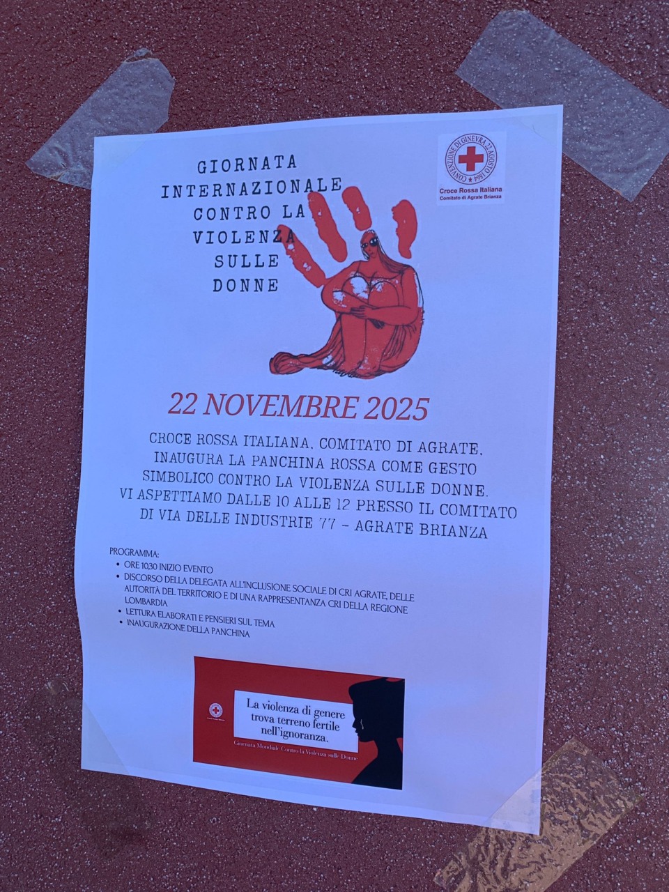 Una panchina rossa nella sede della Croce Rossa di Agrate