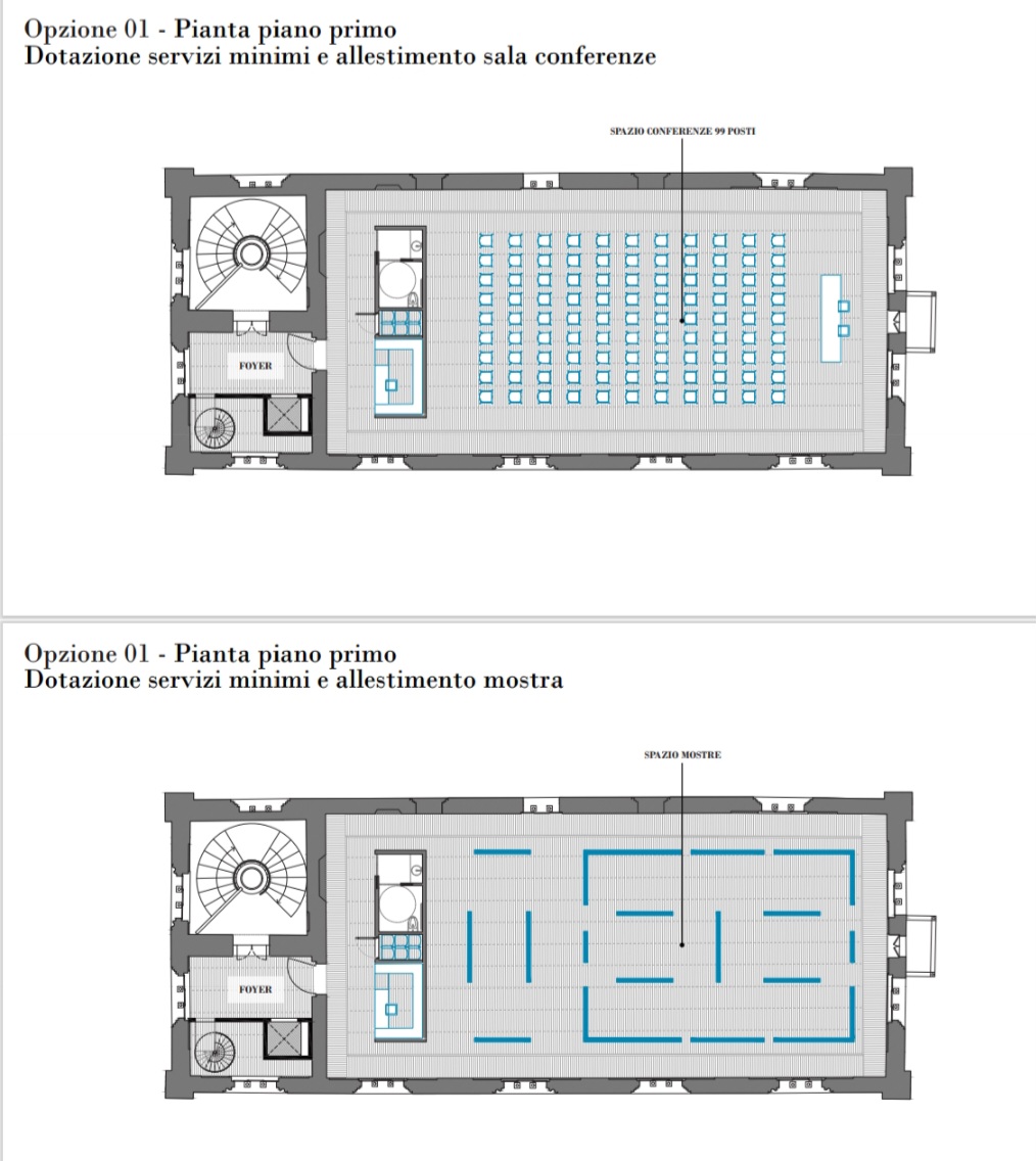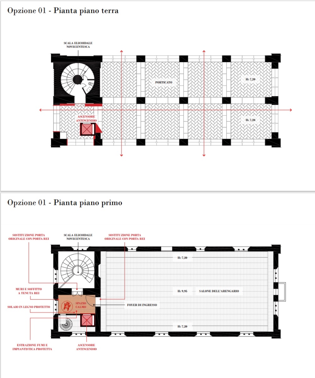 Entrambe le ipotesi presentate dallo Studio sono state l’esito di un percorso di confronto approfondito con i rappresentanti della Soprintendenza Archeologia, Belle Arti e Paesaggio e con il Comando dei Vigili del Fuoco e includono la demolizione dell’attuale scala esterna, costruita negli anni Ottanta, oggi non più idonea. La demolizione della scala consentirà inoltre una più ampia fruizione del portico dell’Arengario.