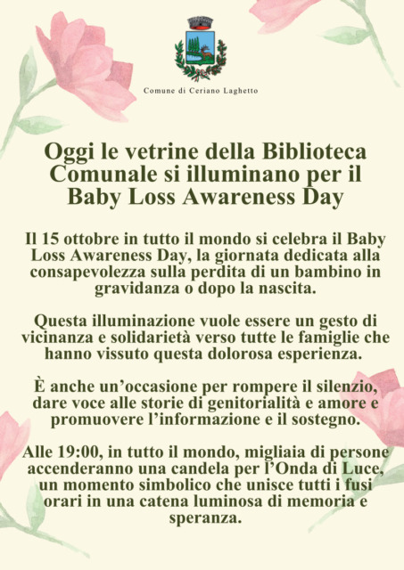 Anche il Comune di Ceriano Laghetto partecipa oggi, 15 ottobre, al “Baby Loss Awareness Day”, la giornata internazionale dedicata alla consapevolezza sulla perdita di un bambino in gravidanza o dopo la nascita. Un appuntamento che si celebra in questa data in tutto il mondo.