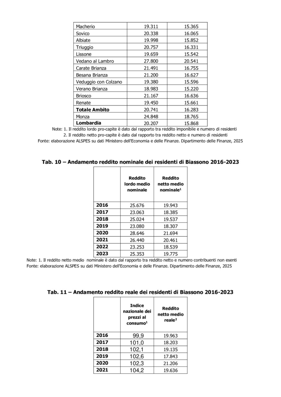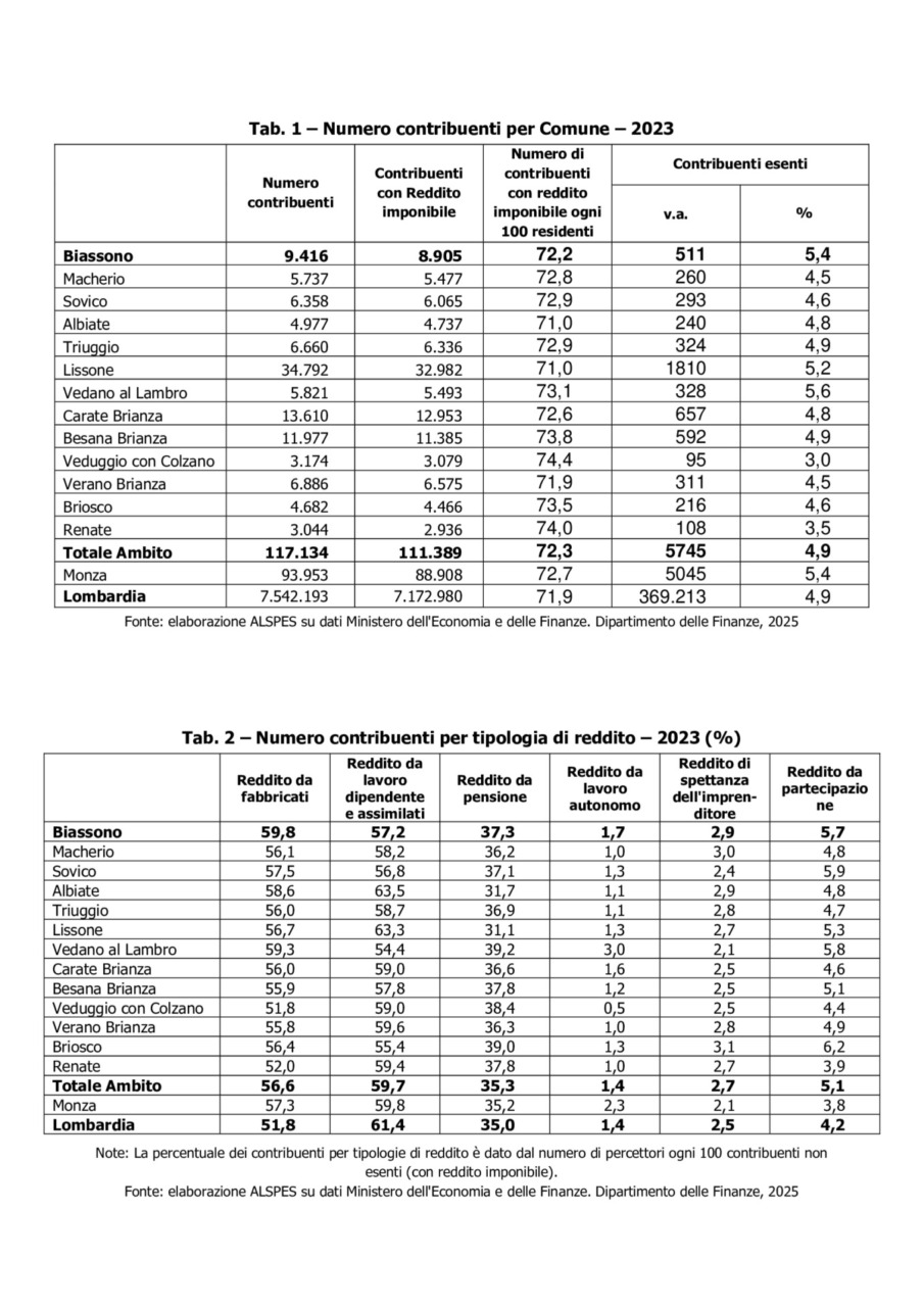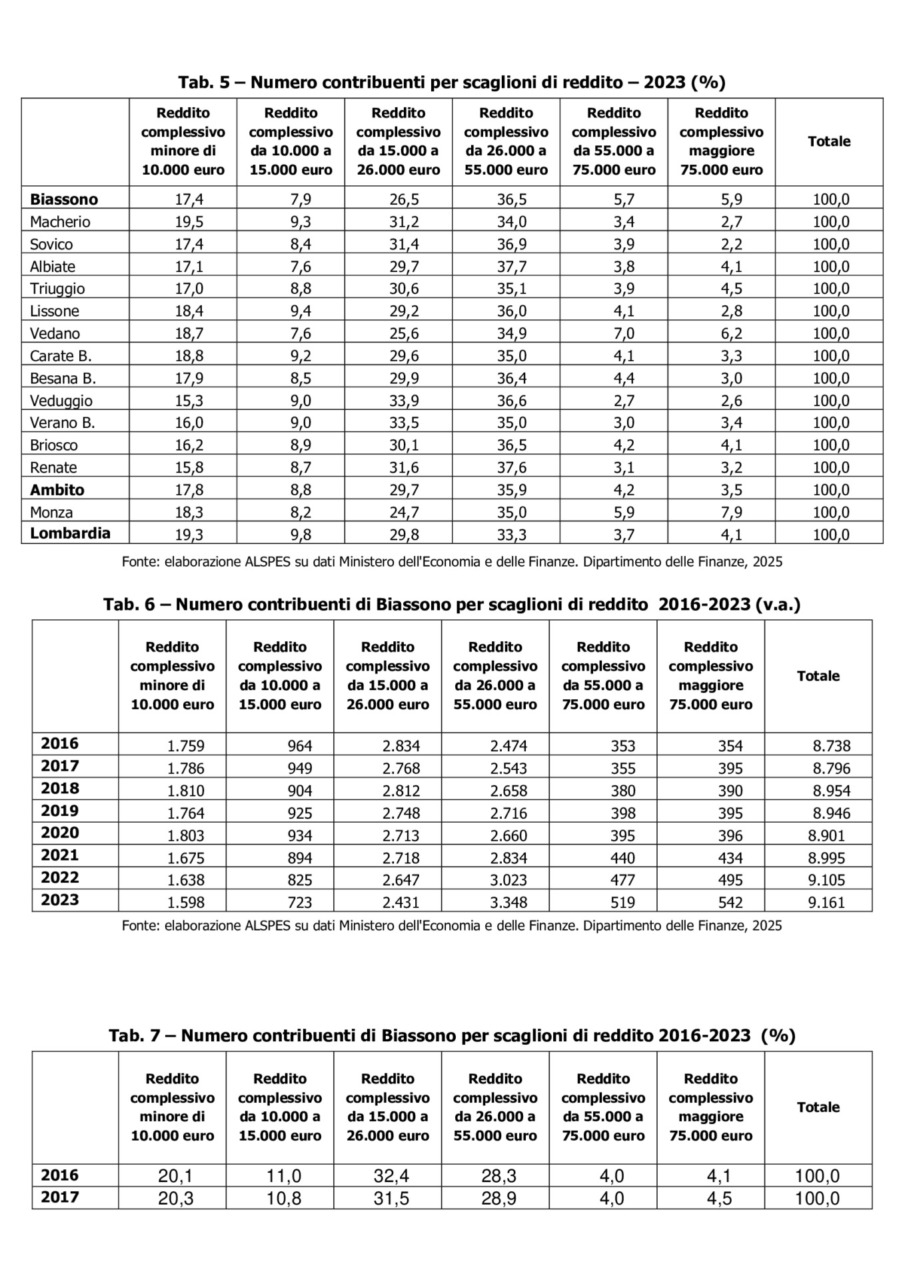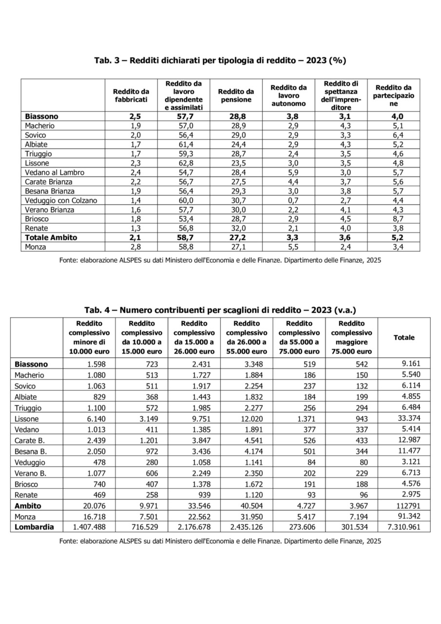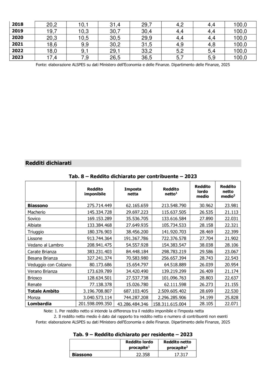 A Biassono i contribuenti sono 9.416 su un totale di 12.332 abitanti nel 2023: «In base al reddito lordo medio dichiarato, i Comuni più ricchi dell’ambito risultano in ordine Vedano (38.038 euro per contribuente), Biassono (30.962) e Carate Brianza (29.586) – spiega Dosa – I tre Comuni più poveri, invece, risultano essere in ordine Veduggio (26.039 euro per contribuente), Renate (26.273) e Verano Brianza (26.409). Monza resta in assoluto la città più ricca (34.199). Il reddito medio netto per un contribuente di Biassono è pari a 23.981 euro all’anno».