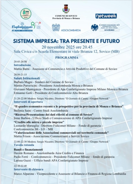 A fare gli onori di casa il sindaco di Sovico, Barbara Magni, affiancata dall’assessore Mattia Barni. Interverranno durante la serata Matteo Parravicini, presidente Assolombarda Monza e Brianza, Giovanni Mantegazza, presidente di Apa Confartigianato Imprese Milano Monza e Brianza, Ermanno Gatti, presidente di Confcommercio Alta Brianza, Stefania Saini, Centro Studi Assolombarda, Irene Barbon, Ufficio Studi e Comunicazione di Apa Confartigianato Imprese, Leonardo Marseglia, direttore Fidicomet Milano – Fondo di Garanzia – Confcommercio Mi – Lo – Mb, Mattia Frison, Associazione Commercianti e Servizi Sovico, Davide Romano, Assolombarda Area Credito e Finanza, Paolo Ferrè, Confcommercio – Presidente Fidicomet Milano – Fondo di Garanzia, Larissa Guzzi, Uffici bandi Apa Confartigianato Imprese, Marco Alparone, vicepresidente e assessore al Bilancio e Finanza di Regione Lombardia.