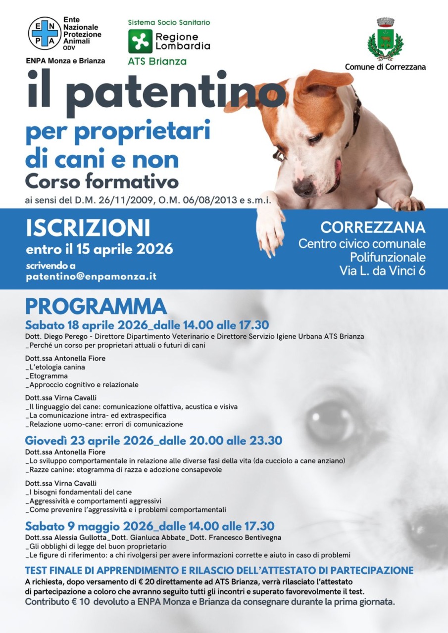 Essere proprietari di un cane non è solo una gioia, ma anche una grande responsabilità, civile e penale. Per fornire gli strumenti necessari a una gestione consapevole e sicura degli animali domestici, arriva a Correzzana una nuova edizione del corso per ottenere il “Patentino per cani”.