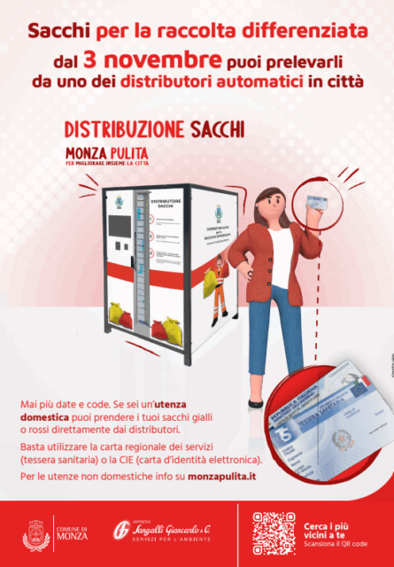 È iniziata lunedì 13 ottobre, con la prima installazione nell’atrio dell’Esselunga di via Buonarroti a Monza, la messa in opera dei nuovi distributori automatici dei sacchi per la raccolta dei rifiuti in città, che saranno operativi a partire da lunedì 3 novembre. I sacchi, gialli per la raccolta di plastica e alluminio e rossi per la frazione indifferenziata, sono destinati alle sole utenze domestiche.