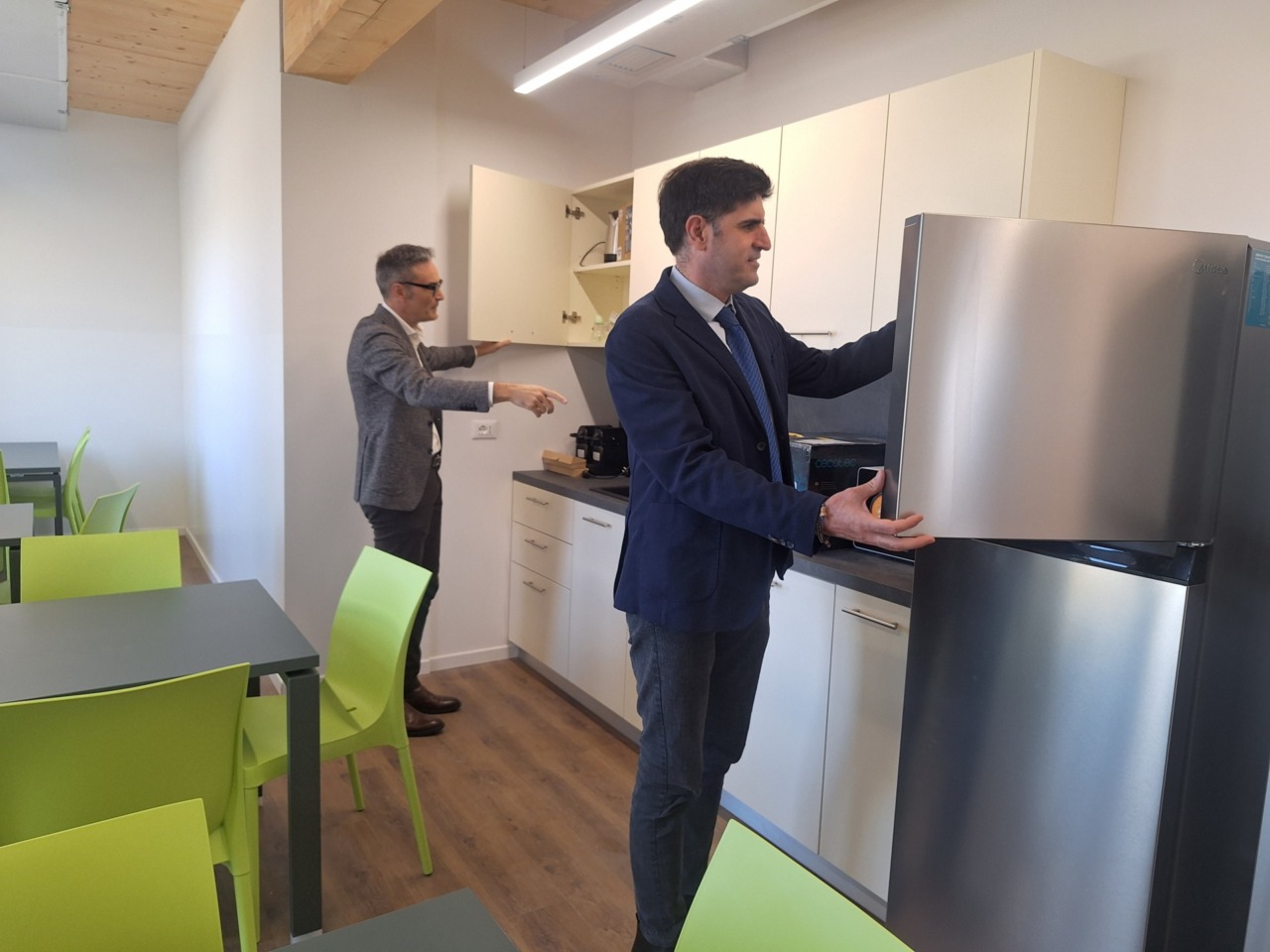 L’edificio è stato progettato con attenzione anche alla sostenibilità: si tratta di una struttura tecnologicamente all’avanguardia, classificata Nzeb (Nearly Zero Energy Building), quindi a emissioni quasi zero, con prestazioni superiori anche alla classe A4. Sono stati installati impianti fotovoltaici e applicati i criteri ambientali minimi, con sistemi di domotica e consumi energetici ridotti al minimo. Per la costruzione è stato scelto il sistema in legno X-LAM, una tecnologia che garantisce elevate prestazioni energetiche e strutturali. L’edificio è dotato di riscaldamento a pavimento alimentato da pompe di calore e di ampie superfici vetrate che favoriscono l’illuminazione naturale, riducendo ulteriormente i consumi. È presente inoltre una vasca di raccolta delle acque piovane utilizzata per l’irrigazione automatizzata del verde, in un’ottica di risparmio energetico e ambientale. L’utilizzo del legno, visibile anche nel soffitto, contribuisce a rendere gli ambienti più accoglienti e a creare un clima più caldo e umano.