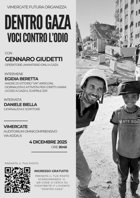Il prossimo 4 dicembre la cittadinanza è invitata a una serata importante di informazione con testimonianze dirette, foto e video di chi ha visto dall’interno l’inferno di Gaza. L’occasione per ascoltare un’autorevole testimonianza diretta da “dentro Gaza”, come recita il titolo dell’iniziativa: l’appuntamento è alle ore 20.45 all’Auditorium dell’Omnicomprensivo di via Adda 6 a Vimercate.