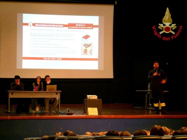 L’iniziativa è stata promossa dai rappresentanti d’istituto Alessandro Cunegatti, Nicola Romano, Angelo Norelli e Bianca Bogani e ha visto l’intervento dell’ispettore antincendi, ingegner Stefano Sica, del Corpo Nazionale dei Vigili del Fuoco – Comando di Monza e Brianza.
