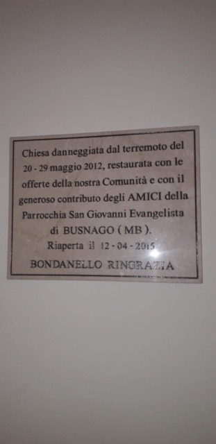 Un gesto simbolico rimasto nel cuore di molti è quello della tegola consegnata all’ex sindaco di Busnago, Marco Corti, a don Eugenio Boriotti – attuale parroco di Busnago – e al gruppo parrocchiale durante una visita a Bondanello. Una piccola tegola, semplice, ma che è diventato il segno concreto dell’inizio dei lavori di ricostruzione: «Era come dire: ci siamo, siamo con voi, ripartiamo insieme», ha raccontato il parroco.