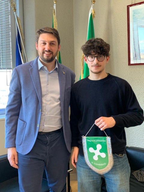 Fabio Cigaina, studente del liceo Banfi, accolto dal consigliere regionale Alessandro Corbetta.
