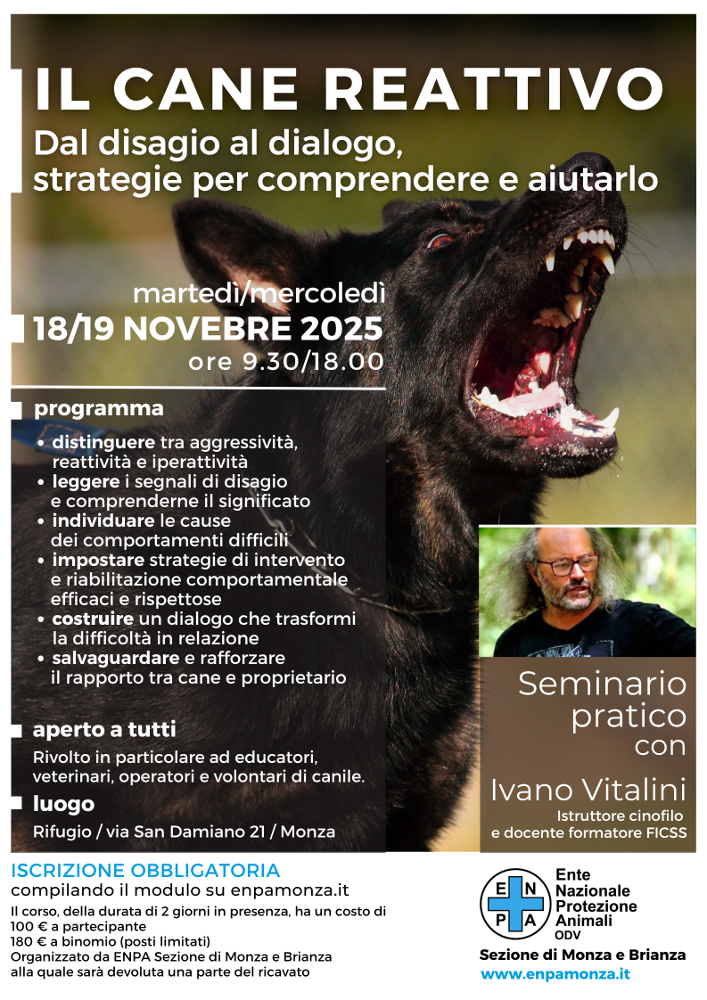 Il corso, dal titolo “Il cane reattivo. Dal disagio al dialogo, strategie per comprendere e aiutarlo”, offrirà un percorso di due giornate presso il Rifugio di Monza per approfondire le origini dei comportamenti problematici e imparare a intervenire con empatia, consapevolezza e strumenti concreti.