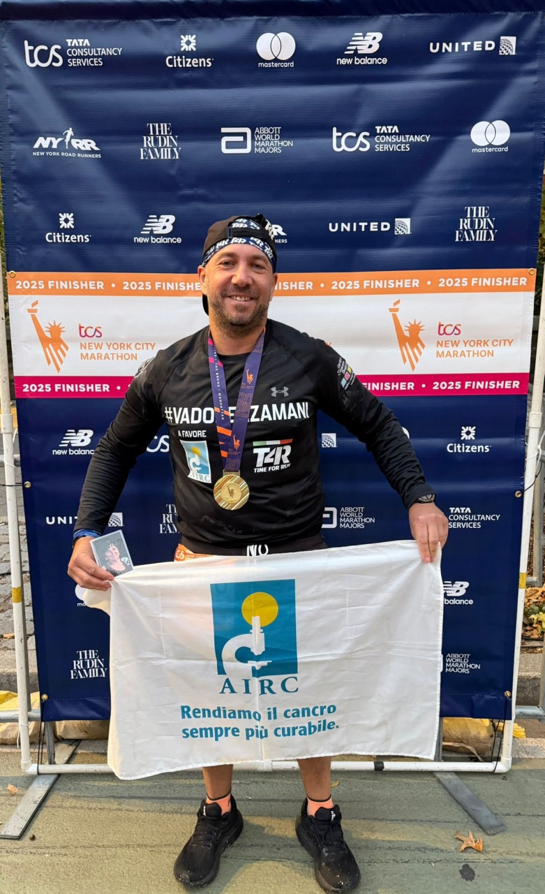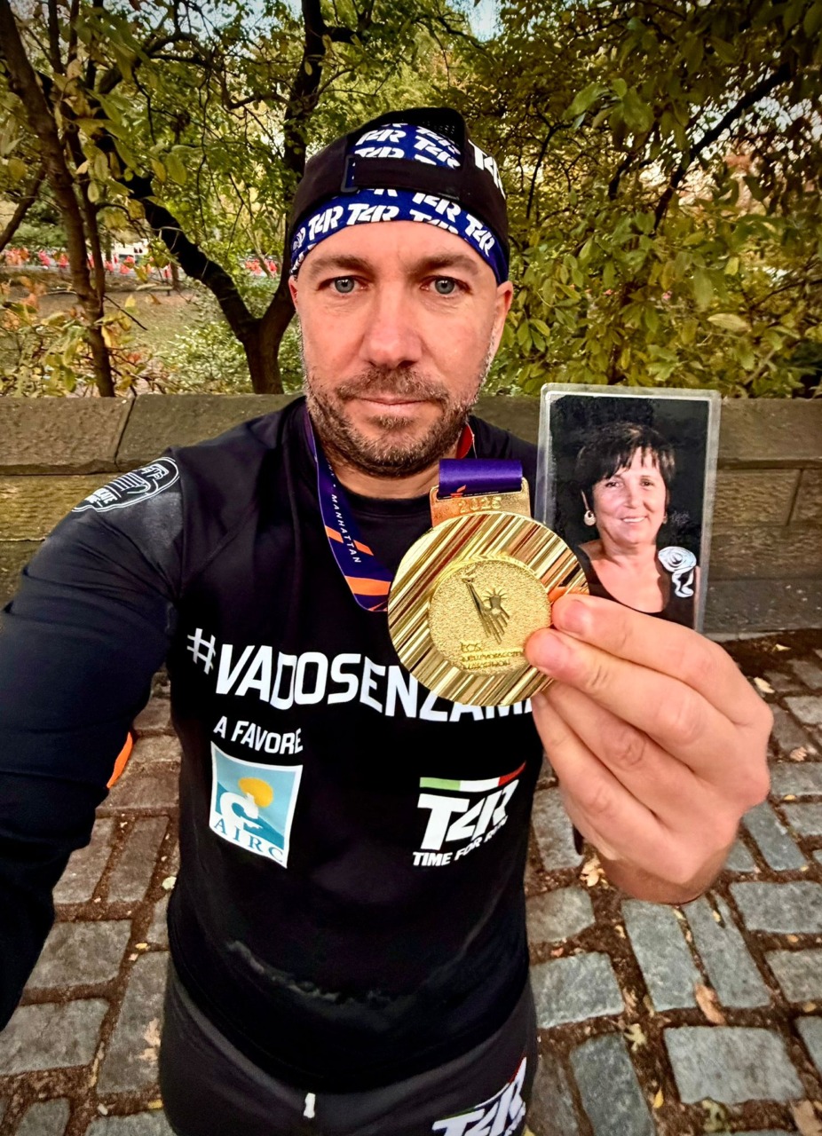 Il runner ha coronato il sogno di portare idealmente accanto a sé a mamma scomparsa alcuni mesi fa; intanto prosegue la raccolta fondi per Airc.