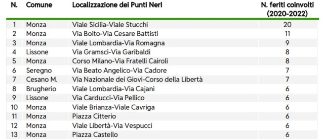 La maggior parte di quelli più gravi si concentra proprio a Monza. Tra il 2020 e il 2022 il record di feriti si è registrato all’incrocio viale Sicilia-viale Stucchi, con 20 persone coinvolte. Seguono via Boito-via Battisti (11 feriti) e viale Lombardia-via Romagna (9 feriti). Ma l’elenco dei punti neri è lungo: spiccano anche via Gramsci-via Garibaldi a Lissone (8 feriti), corso Milano-via Fratelli Cairoli a Monza (8), e le criticità in comuni limitrofi come Seregno (via Beato Angelico-via Cadore, 7 feriti) e Cesano Maderno (via Nazionale dei Giovi-corso Libertà, 7).