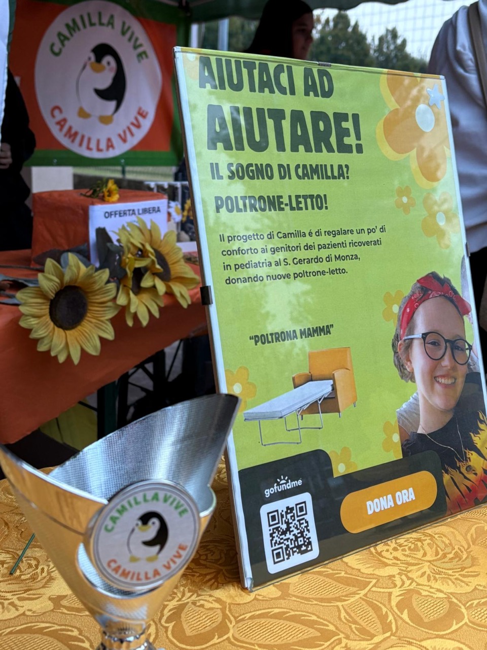Durante uno dei numerosi ricoveri presso la Pediatria dell’ospedale San Gerardo d Monza, Camilla aveva espresso il desiderio che i genitori dei bambini costretti in ospedale avessero almeno delle poltrone-letto per riposare un po’ la notte. Tanti gli amici che si sono stretti attorno ai genitori Monica e Luca e alla sorella Asia per realizzare il sogno di Camilla. Quello che è accaduto anche grazie all’evento organizzato dall’associazione «Camilla Vive», presieduta dalla mamma di Camilla, Monica Lorenzon, a favore di una raccolta fondi, che ha visto il coinvolgimento delle associazioni locali «Amici di Lollo» con la presidente Daniela Perego e «Amici della Brianza Aps», con il presidente Fabio Di Pasquali insieme al suo gruppo di soci volontari. A fare gli onori di casa è stato don Daniele Stocco.