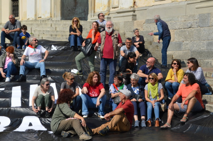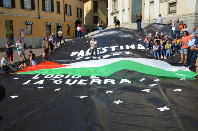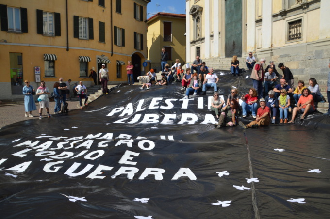 Un enorme telo nero, con la scritta «Palestina libera. Fermare il massacro, l’odio e la guerra». Così hanno inteso lanciare un messaggio forte e chiaro Anpi ed Emergency durante il flashmob che si è svolto sabato in piazza IV Novembre a Carate Brianza e che ha visto la partecipazione di quasi un centinaio di partecipanti.