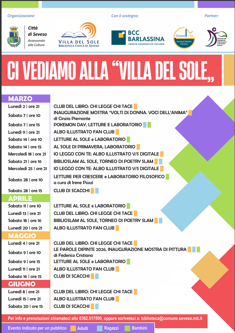 Proprio a questo proposito, la biblioteca ha lanciato il manifesto-raccoglitore “Ci vediamo alla Villa del Sole” che racchiude da qui all’estate gli eventi culturali già in cartellone a Villa del Sole. Un calendario sempre in evoluzione che da qui ai prossimi mesi sarà ulteriormente arricchito.