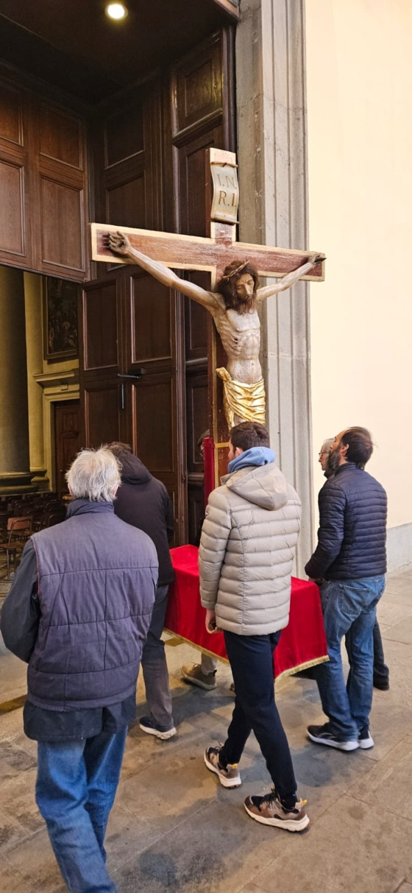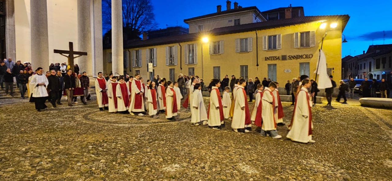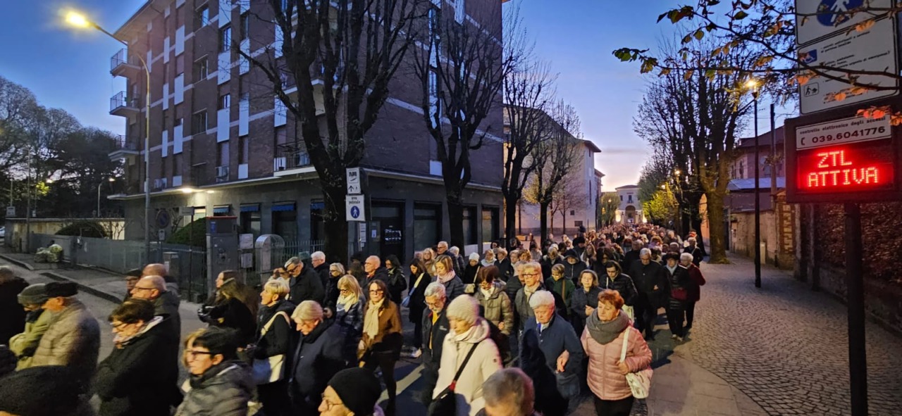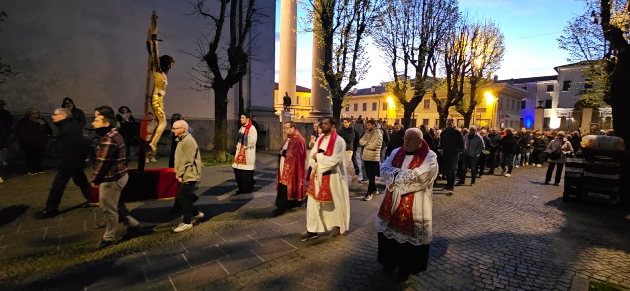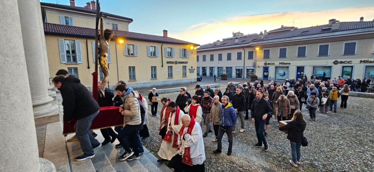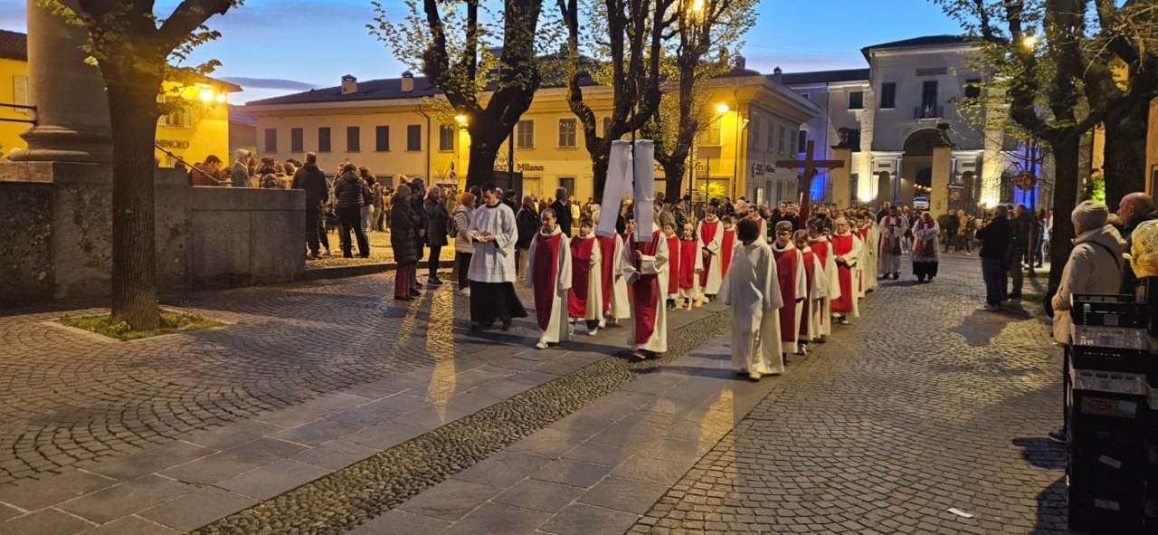 Prima il momento di preghiera celebrato in chiesa; poi, il corteo per le vie del centro, aperto dal maestoso Crocefisso portato a spalla dai tanti volontari che si alternano durante la processione. Dietro ad esso, le due foltissime ali di fedeli, precedute dal parroco don Paolo Brambilla e i sacerdoti della comunità: