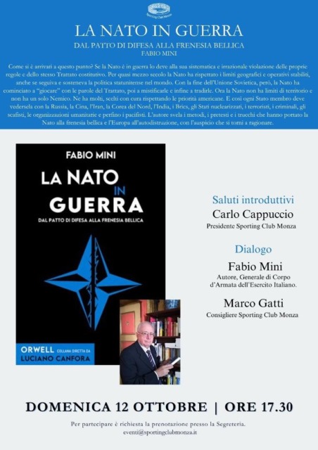 Intanto domenica prossima, 12 ottobre, è atteso allo Sporting Club Monza un ospite speciale: il Club avrà infatti l’onore di accogliere il Generale Fabio Mini per la presentazione del suo libro “La NATO in guerra”. Appuntamento alle ore 17.30.