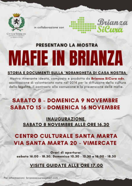 L’Amministrazione Comunale di Vimercate in collaborazione con l’associazione Brianza SiCura odv presentano la realizzazione di “Mafie in Brianza. Storia e documenti sulla ‘ndrangheta di casa nostra”, la prima mostra documentaria itinerante dedicata all’analisi e alla divulgazione delle vicende legate alla criminalità organizzata di matrice calabrese nel territorio brianzolo.