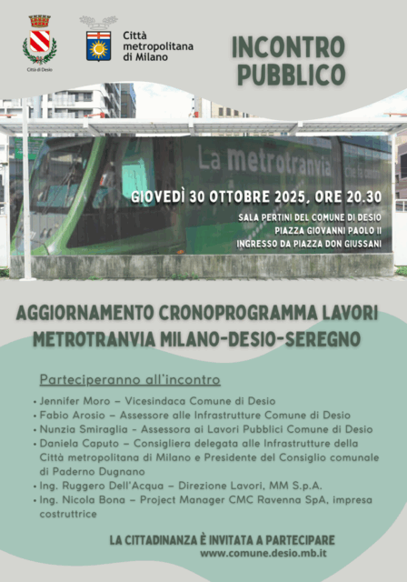 Se ne parlerà giovedì 30 ottobre 2025 a partire dalle ore 20.30, presso la Sala Pertini del Comune di Desio (ingresso da piazza Don Giussani). L’appuntamento – fa sapere l’Ammnistrazione comunale – sarà l’occasione per presentare il nuovo cronoprogramma e fornire informazioni piu’ dettagliate sulle tempistiche e sulle prossime fasi dei cantieri.