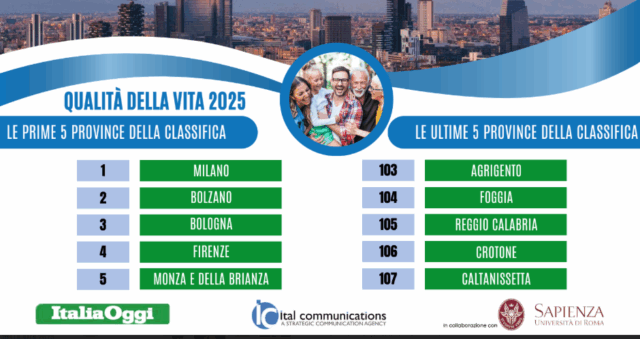 mentre si segnala un significativo avanzamento in graduatoria di Rimini e Ascoli Piceno, rispettivamente al 12° e 15° posto, con oltre venti posizioni guadagnate rispetto al 2024. Ancora in fondo alla classifica Caltanissetta (107ª), preceduta da Crotone (106ª), che scende di cinque posizioni in un anno e Reggio Calabria (105ª), che invece conquista un posto. Da rilevare, in negativo, Foggia, che passa dalla 93ª alla 104ª postazione in classifica, Pordenone dalla 9ª alla 23ª e Gorizia dalla 26ª alla 52ª.