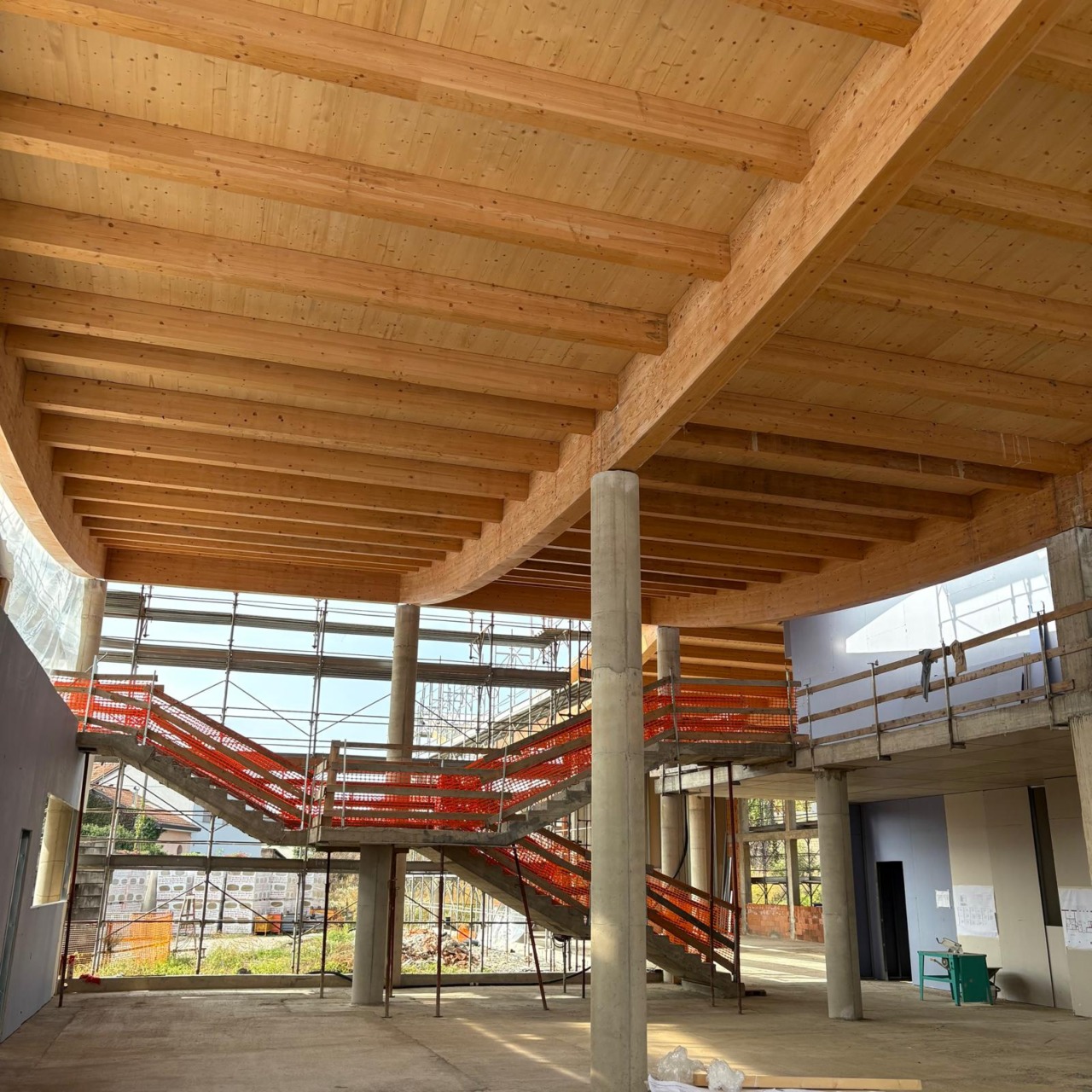 Sono state realizzate le murature perimetrali, sono in corso le opere di cartongesso mediante la posa delle pareti divisorie interne, a cui seguiranno direttamente i lavori per gli impianti elettrici e meccanici. La struttura avrà una composizione articolata (già riconoscibile in questa fase) con l’unione di forme circolari e rettangolari e avrà tra le sue caratteristiche quella di garantire trasparenza all’esterno e luminosità interna, grazie alle grandi vetrate che andranno a comporre le facciate.