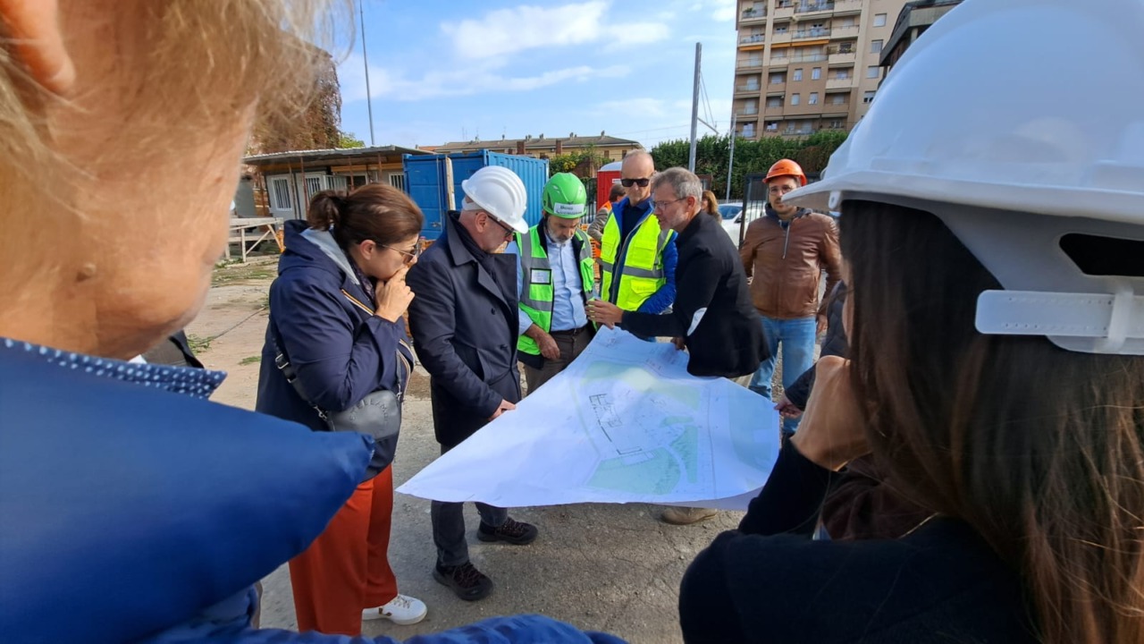 Sopralluogo nel cantiere della nuova biblioteca comunale che sta sorgendo sul lotto “ex Trancia”, lungo il tracciato della ferrovia, tra le vie Solferino, Goito e San Martino, in prossimità della stazione nuova e prospiciente quella vecchia. I lavori hanno avuto inizio nel settembre del 2024 e, ad oggi, sono state completate tutte le opere strutturali nonché la spettacolare struttura di copertura, che attraverso le travi curve principali rappresenterà anche un marchio estetico e identificativo.