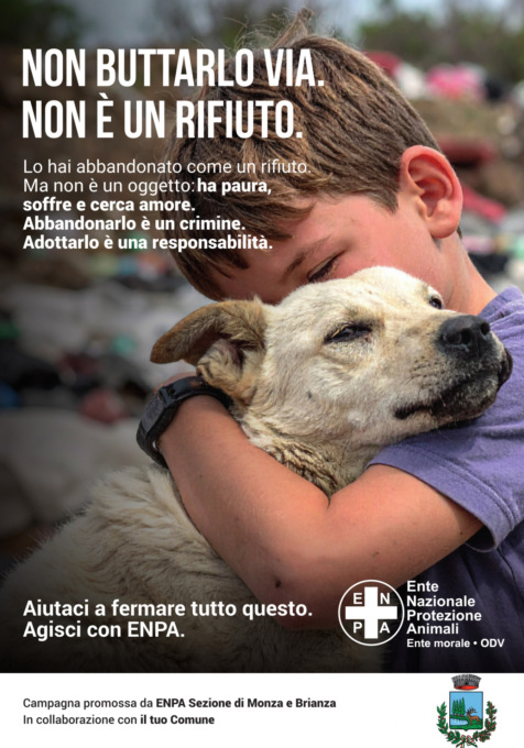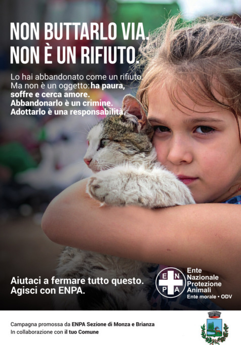 E’ stata avviata la campagna informativa che ha l’obiettivo di interrompere una pratica incivile che si può riscontrare durante tutto l’anno e che purtroppo si intensifica soprattutto in estate, quando aumentano cani e gatti che vengono abbandonati per strada o nelle campagne, lontani da casa, spesso condannandoli ad una fine tragica. La campagna realizzata con affissioni murarie, punta sulle immagini di un bambino che abbraccia un cane e di una bambina che abbraccia una gatto, accompagnate appunto dall’invito principale: “Non buttarlo via, non è un rifiuto”. Il monito continua: “Lo hai abbandonato come un rifiuto. Ma non è un oggetto: ha paura, soffre e cerca amore. Abbandonarlo è un crimine. Adottarlo è una responsabilità”.