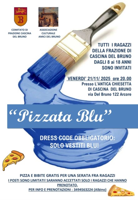 Il dress code prevede l’obbligo, per gli invitati,  di vestirsi tutti quanti di blu (per info e prenotazioni 3494563224 – posti limitati). Una pizzata che dunque assume un duplice scopo: creare un momento aggregativo per i ragazzi della frazione e, al tempo stesso, gettare le basi per l’organizzazione di eventi futuri che possano sempre più farli sentire protagonisti.