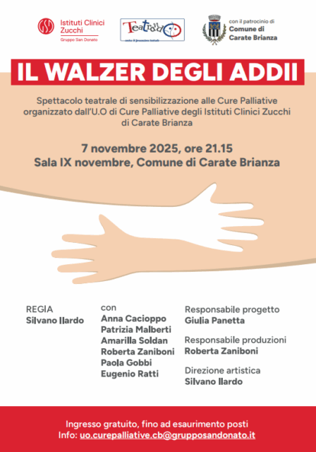 Questo è “Il Walzer degli addii” in programma venerdì 7 nvemmbre alla 21.15 presso la Sala IX Novembre del Comune di Carate Brianza. Uno spettacolo promosso dall”Unità Operativa di Cure Palliative del Presidio di Carate Brianza e a cura di Teatrando – Centro di Produzione e Formazione teatrale. Come detto si tratta di una rappresentazione che racconta con sincerità la malattia e la perdita di una persona cara. L’obiettivo è promuovere una maggiore consapevolezza sul valore delle cure palliative e nello specifico dell’hospice, spesso ancora poco conosciuto e frainteso.