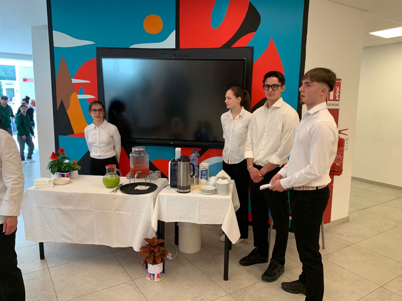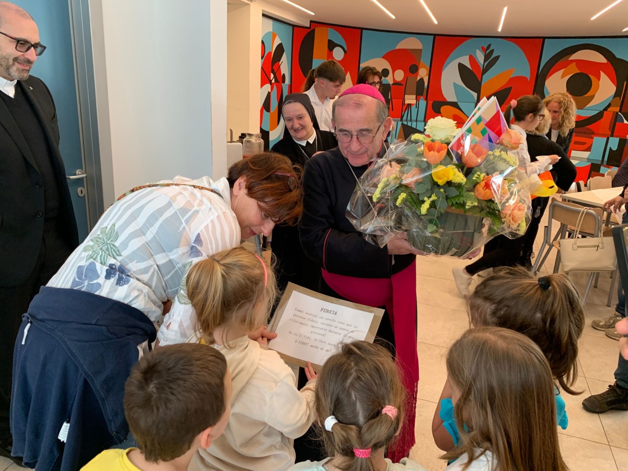 Poi la visita alla scuola, con la possibilità anche di assaporare i dolci realizzati dalle studentesse e dagli studenti del corso di pasticceria e panetteria. Dai piccoli della materna, invece, in dono un grande mazzo di fiori e un biglietto con una dedica speciale.