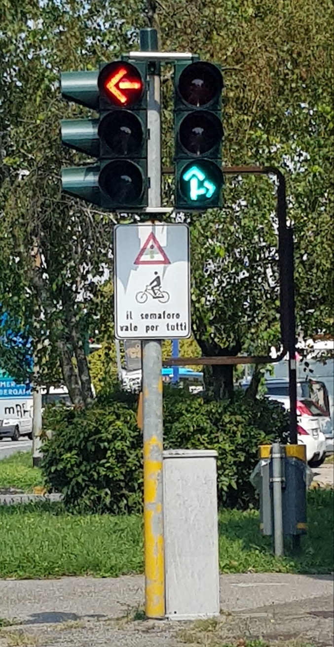 Evidentemente il comando della Polizia locale, che in corrispondenza dell’incrocio di Sant’Alessandro ha posizionato le telecamere per multare chi transita con il semaforo rosso, ha ritenuto di dover posizionare il cartello “speciale” per avvisare i ciclisti che il Codice della strada vale anche per loro.