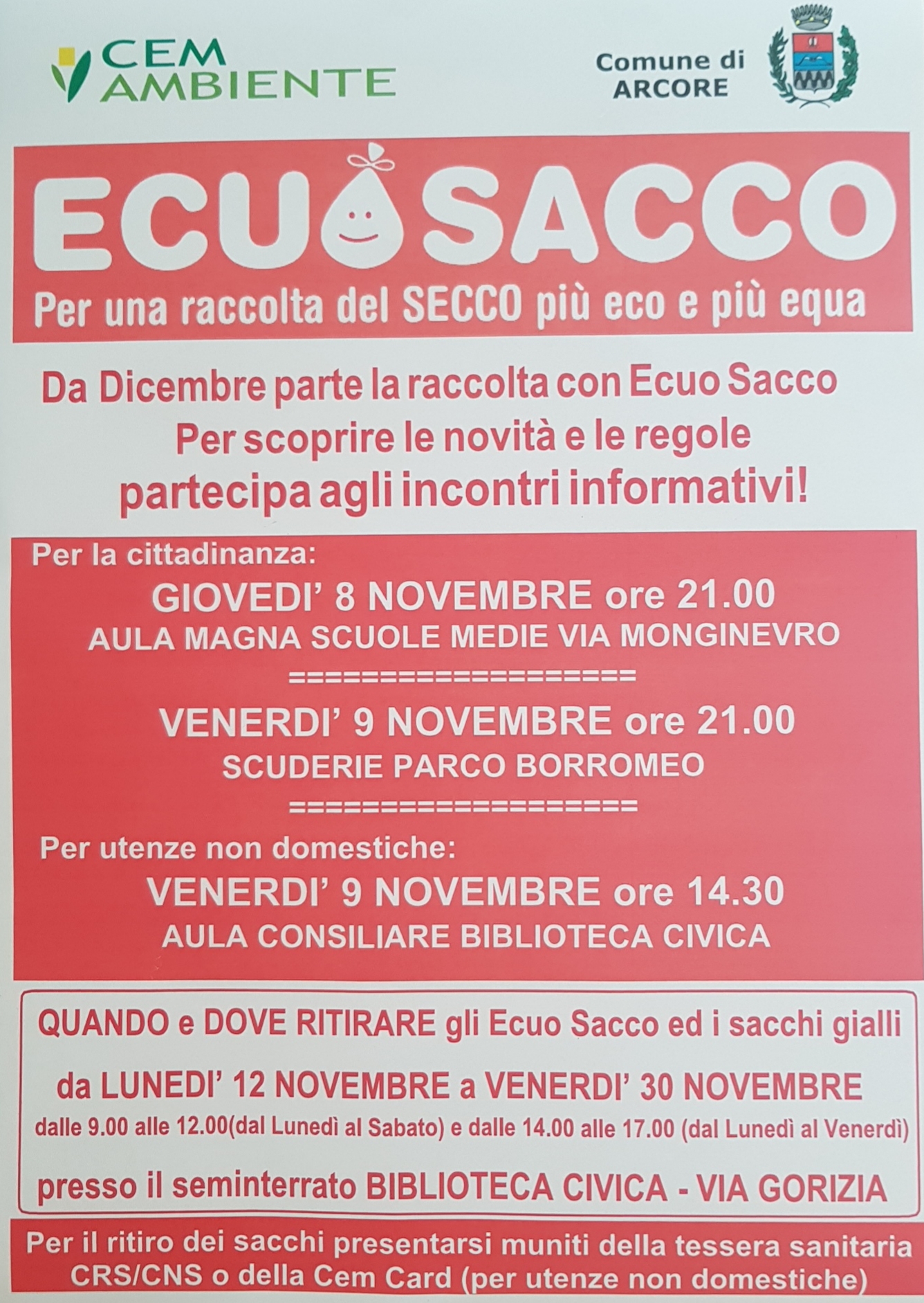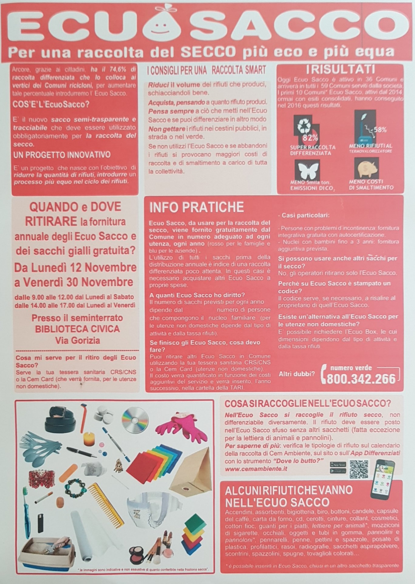 “Grazie al contributo dei cittadini, il nostro paese ha raggiunto il 74,56% di raccolta differenziata, una percentuale che ci colloca ai vertici della classifica brianzola – spiega l’assessore all’Ecologia Fausto Perego – Per aumentare ulteriormente questa percentuale procederemo all’introduzione dell’Ecuosacco. Il progetto Ecuosacco nasce proprio con l’obiettivo di ridurre la quantità di rifiuti, introdurre un processo più equo e creare una maggiore consapevolezza nei cittadini. L’Ecuosacco, da usare per la raccolta del secco, verrà fornito gratuitamente dal Comune in numero adeguato ad ogni utenza, ogni anno – conclude l’assessore Perego – La dotazione annuale dipenderà dal numero di persone che compongono il nucleo famigliare o dal tipo di attività e dalla tassa rifiuti, per le utenze non domestiche. Aspettiamo la cittadinanza agli incontri predisposti per spiegare loro tutte le novità”.
