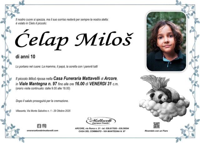 Il piccolo Milos riposa nella casa funeraria Mattavelli diArcore fino alle 16 di venerdì 31 (orario visite dalle 9 alle 18). Dopo il saluto proseguirà per la cremazione.
