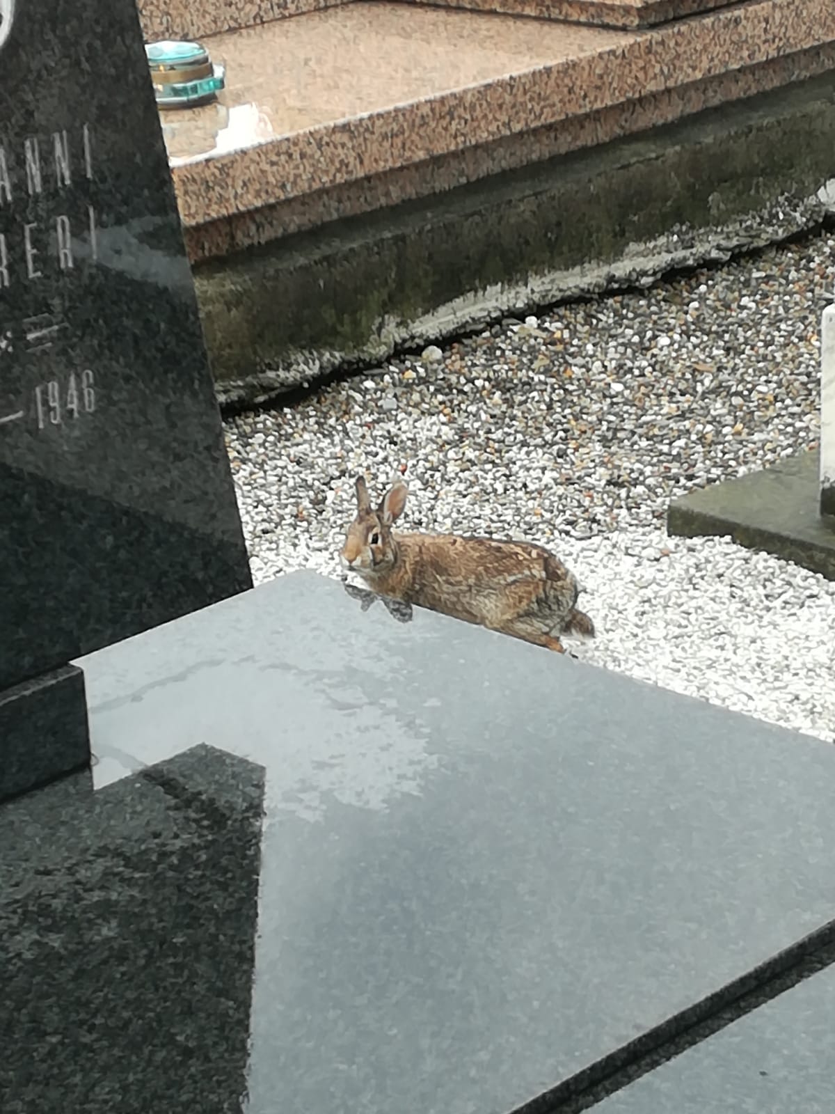 Perché i ghiotti erbivori che arrivano al cimitero dal campo vicino, si mangiano i fiori che i parenti dei defunti depositano sulle tombe a terra. I leprotti ci sono da tanto ma ultimamente si aggira per il cimitero un coniglio piuttosto grosso, probabilmente ha vissuto in casa perché non scappa alla vista degli umani. Sta di fatto che da quando è arrivato i casi di fiori mangiati sono aumentati.