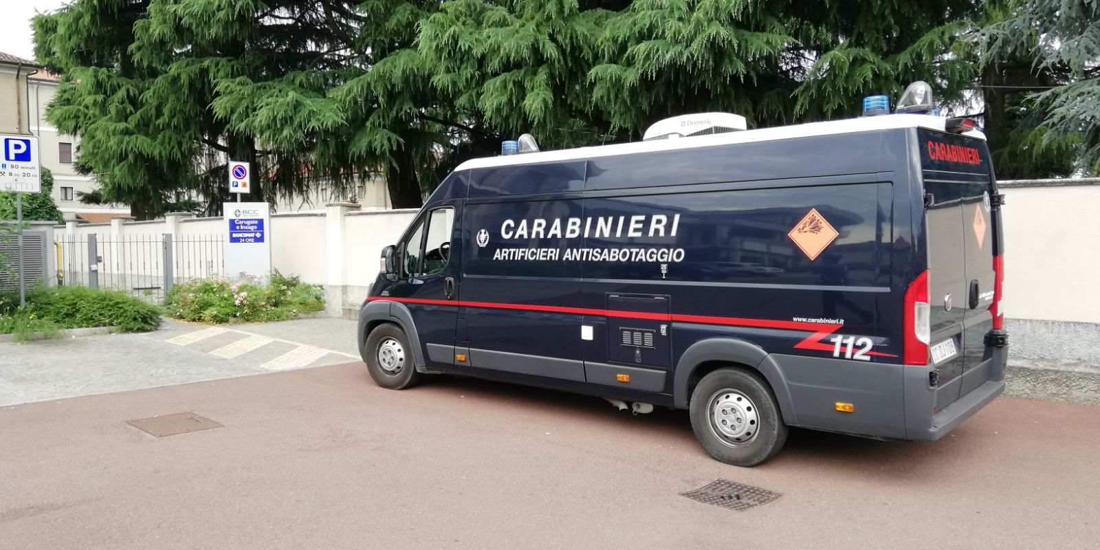 Allarme bomba in banca, artificieri, carabinieri e Polizia locale in azione a Busnago.