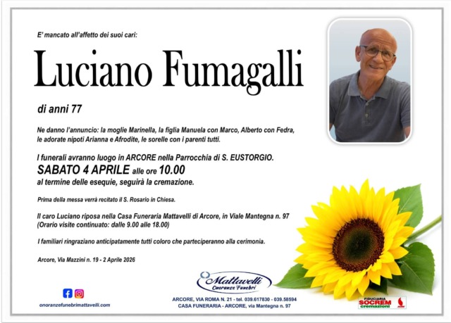 Fumagalli, molto conosciuto nella frazione La Cà, dove abitava, lascia la moglie Marinella e i figli Manuela e Alberto.