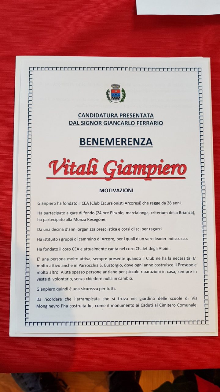 Invece l’attestato di benemerenza è andato a: Valerio Viganò, capogruppo degli Alpini di Arcore; Giampiero Vitali, uno dei soci che nel 1962 hanno fondato il C.E.A (Club Escursionisti Arcoresi). Attestato di benemerenza anche per Giuseppe Redaelli, conosciuto in paese come nonno Beppe, un volto noto tra i bambini di Arcore per la sua attività come volontario nel progetto Piedibus; e Carlo Sala, volontario molto attivo in città e responsabile della Caritas della comunità pastorale.