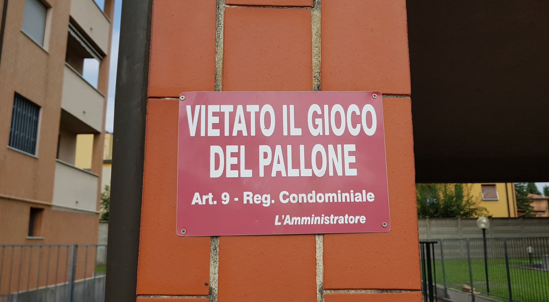 A dire il vero in piazza Pertini due cartelli di divieto al gioco del pallone ci sono, ma sono di dubbia efficacia. Infatti non fanno riferimento ad alcuna ordinanza ma, semplicemente, all’articolo 9 del Regolamento condominiale.