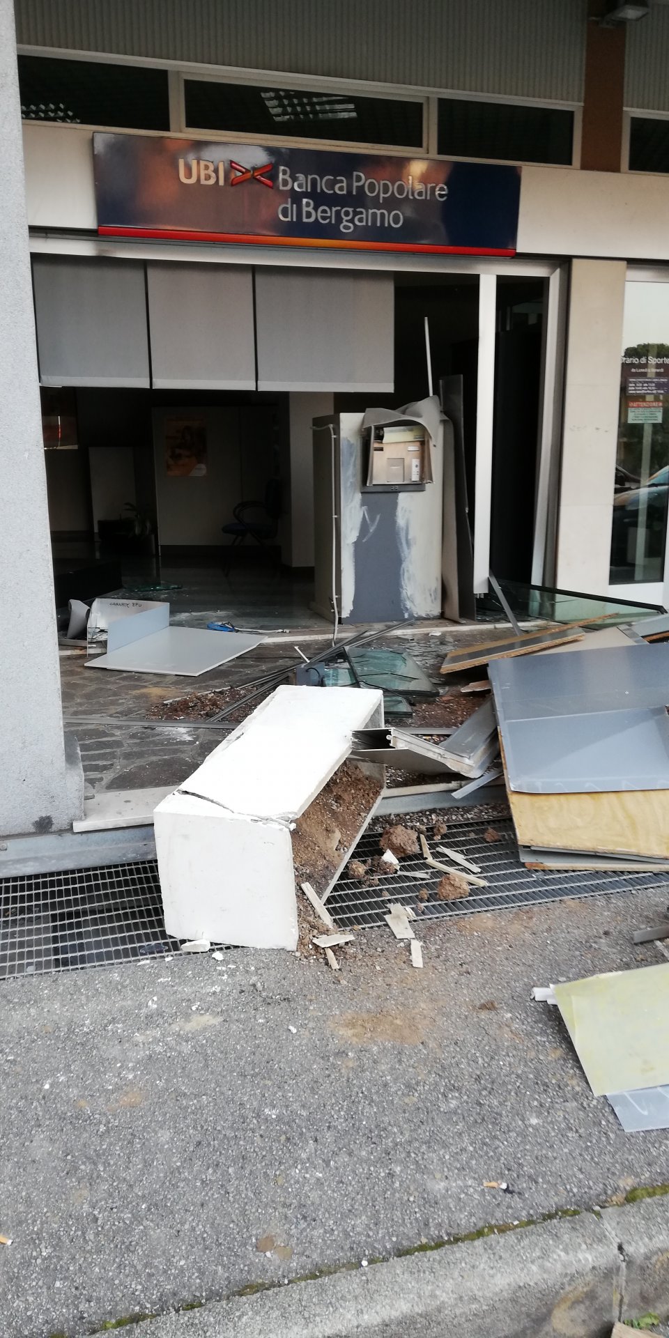 L’allarme è scattato intorno alle quattro di questa notte: un grosso botto e poco dopo la fuga dei malviventi. Sul posto dopo il botto e con l’antifurto attivato, sono arrivati i Carabinieri della stazione di Bernareggio e le guardie private che controllano anche la Banca in centro paese. A terra pezzi del bancomat, uno dei vasi posti davanti all’ingresso, e pezzi della vetrata andata in frantumi. Sulla telecamera posta davanti all’ingresso della Ubi banca i ladri avevano messo un sacchetto per evitare che si potessero vedere anche solo le loro sembianze. Molto probabilmente i ladri hanno utilizzato un mezzo pesante o agricolo per salire sul marcipiede e sfondare la parete dove era presente la cassa continua.
