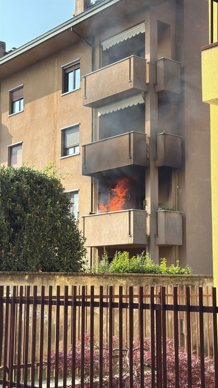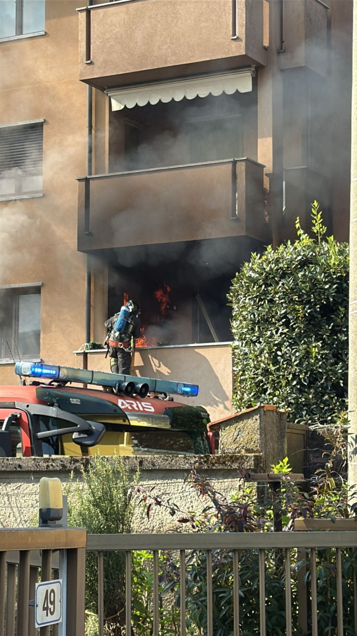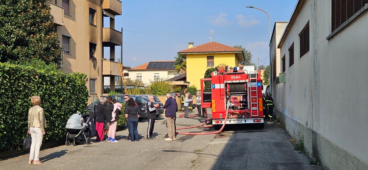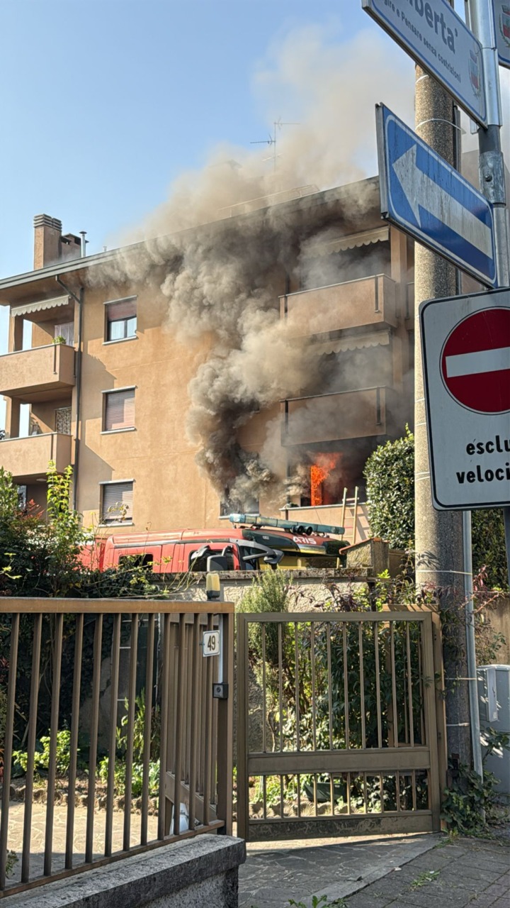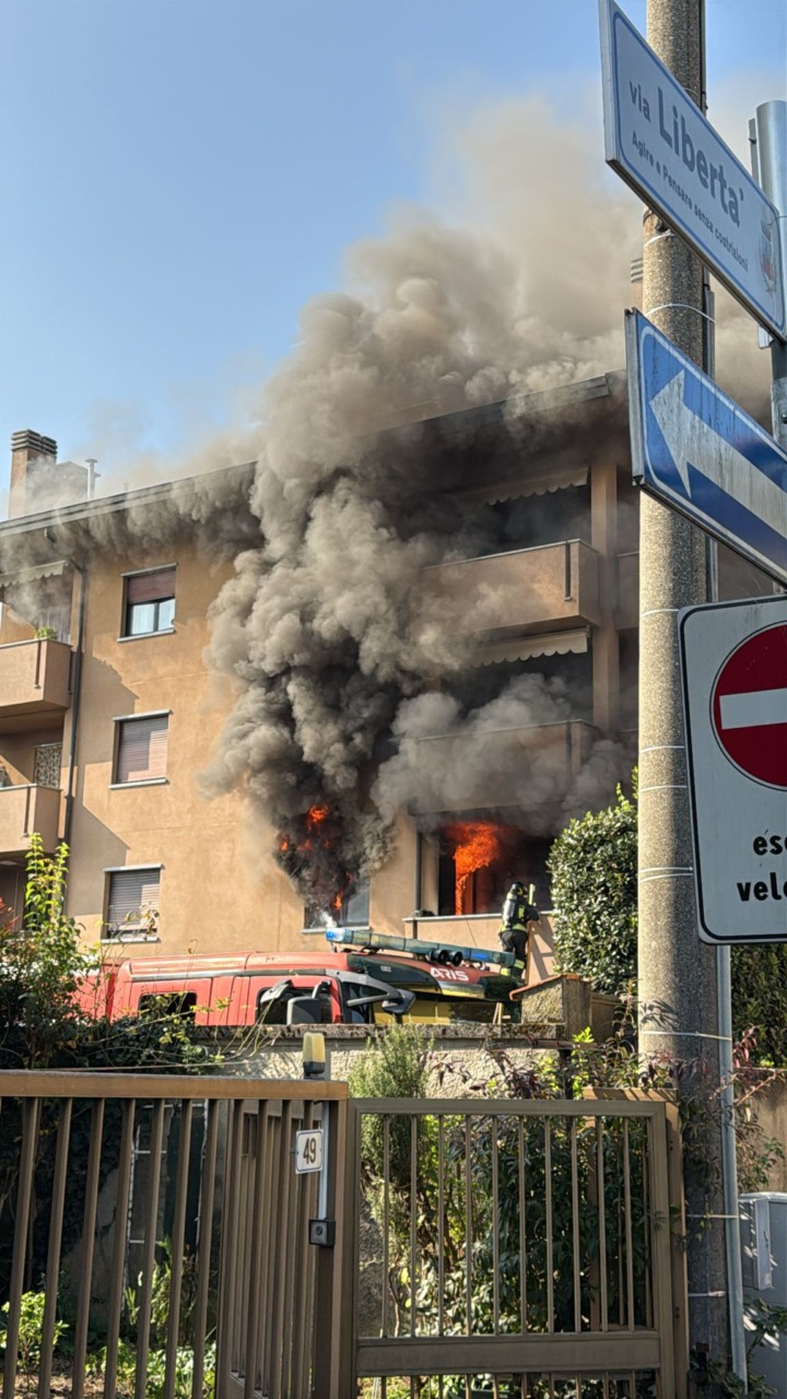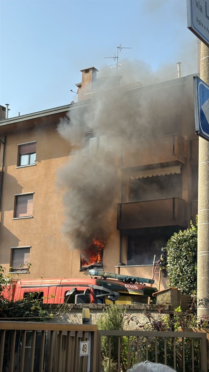 Fiamme in un appartamento. Intervento in corso da parte dei Vigili del fuoco nel primo pomeriggio di oggi, sabato 18 ottobre, a Bernareggio, in via Lamarmora.