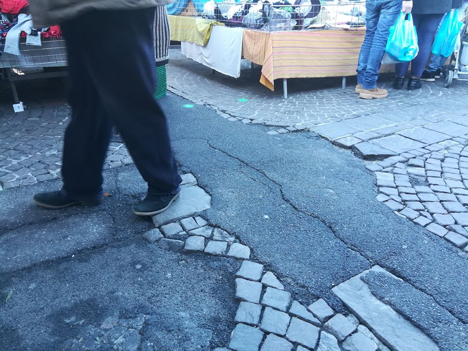 Come detto, il problema è annoso e, al momento, non ha ancora trovato soluzione. In passato, sulla pavimentazione disconnessa e ammalorata sono stati effettuati alcuni rattoppi in catrame, ma con risultati modesti e decisamente brutti da punto di vista estetico. Una criticità che si presenta anche nella giornate di pioggia. Anche in quel caso, più di una volta gli ambulanti sono stati costretti a coprire le buche con assi in legno e cassette vuote della frutta per evitare cadute o non voluti “pediluvi” nell’acqua di buche e pozzanghere.