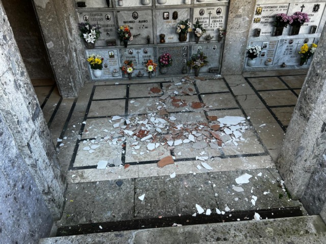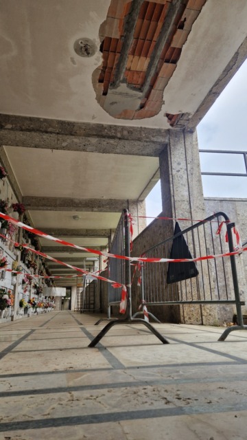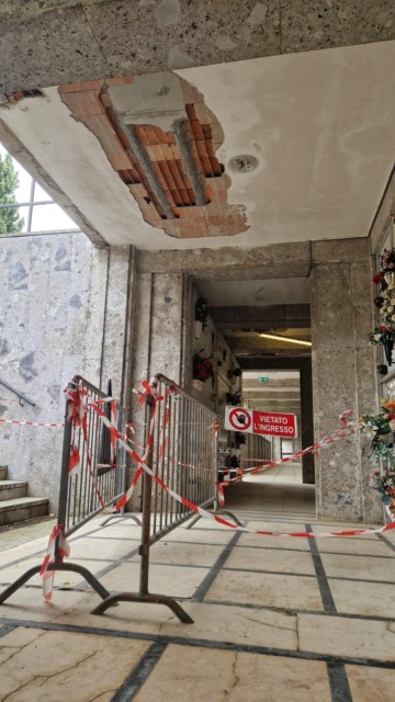 Una tragedia sfiorata che coinvolse i colombari che si trovano nel seminterrato, sotto la cappella del cimitero. Una vera fortuna che nessuno dei visitatori del cimitero transitasse in quella zona in quei minuti. Ad accorgersi, e ad aver udito il frastuono causato dalla caduta dell’intonaco, furono alcuni cittadini che si trovavano nelle vicinanze, e che poco prima erano transitati sotto quella porzione di controsoffitto coinvolto nei cedimenti. Per permettere gli approfondimenti del caso l’area coinvolta nei crolli venne transennata e interdetta alle visite dei parenti ai defunti.