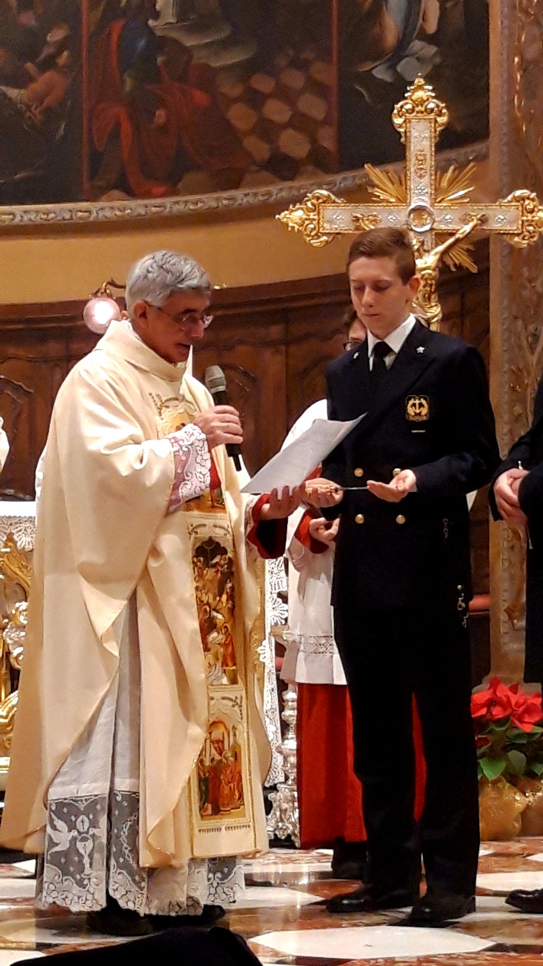 Carate, benedizione dello spadino durante la messa di Natale per un allievo della Marina.  Giacomo Trezzi,  è allievo della scuola navale militare «Morosini» di Venezia e nella notte della Vigilia è stato il protagonista di un momento solenne durante le celebrazioni della messa di mezzanotte. Il don ha benedetto il suo spadino seguendo un particolare rituale, una cerimonia piuttosto inconsueta, che ha incuriosito molti presenti.