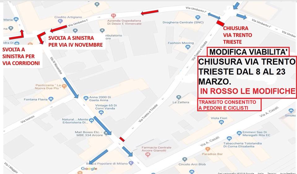 Le auto provenienti da via Roma/via Umberto I avranno l’ obbligo di svolta a sinistra in via Corridoni. Questa seconda modifica per evitare possibili incidenti all’incrocio di via IV Novembre e possibili code