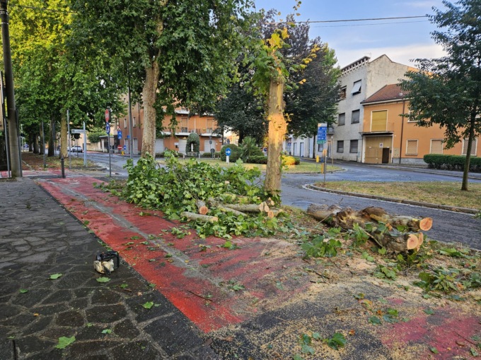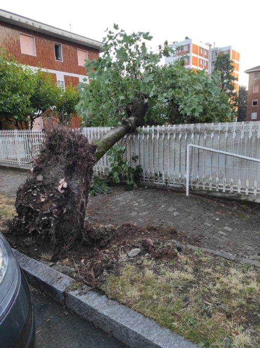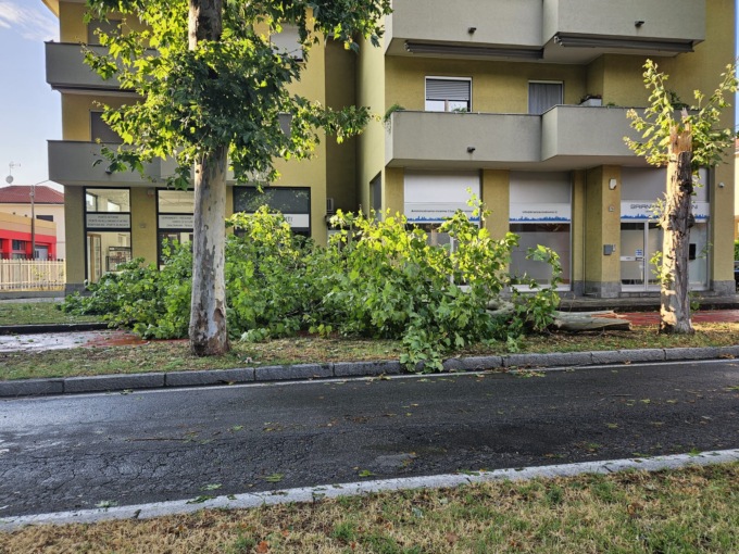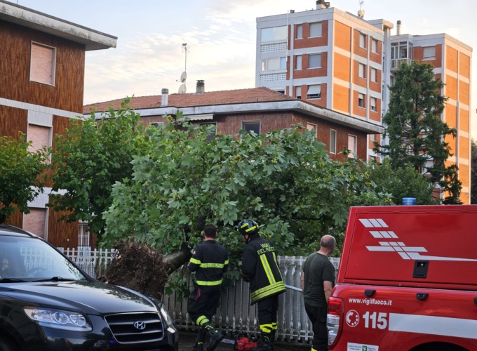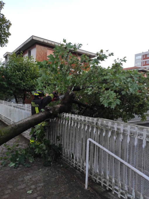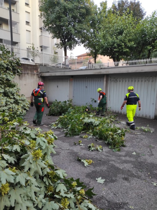 In via Vittorio Emanuele II si è spezzato il tronco di un albero andando ad invadere la pista ciclo-pedonale, in viale Sant’Aquilino invece, un albero si è sradicato e si è abbattuto contro la recinzione di un condominio, occupando il marciapiede e quindi ostruendo il passaggio dei pedoni. Imbracciate le motoseghe, Protezione civile e Vigili del Fuoco si sono adoperati per tagliare il tronco e i vari rami, ripristinando così le condizioni di sicurezza.