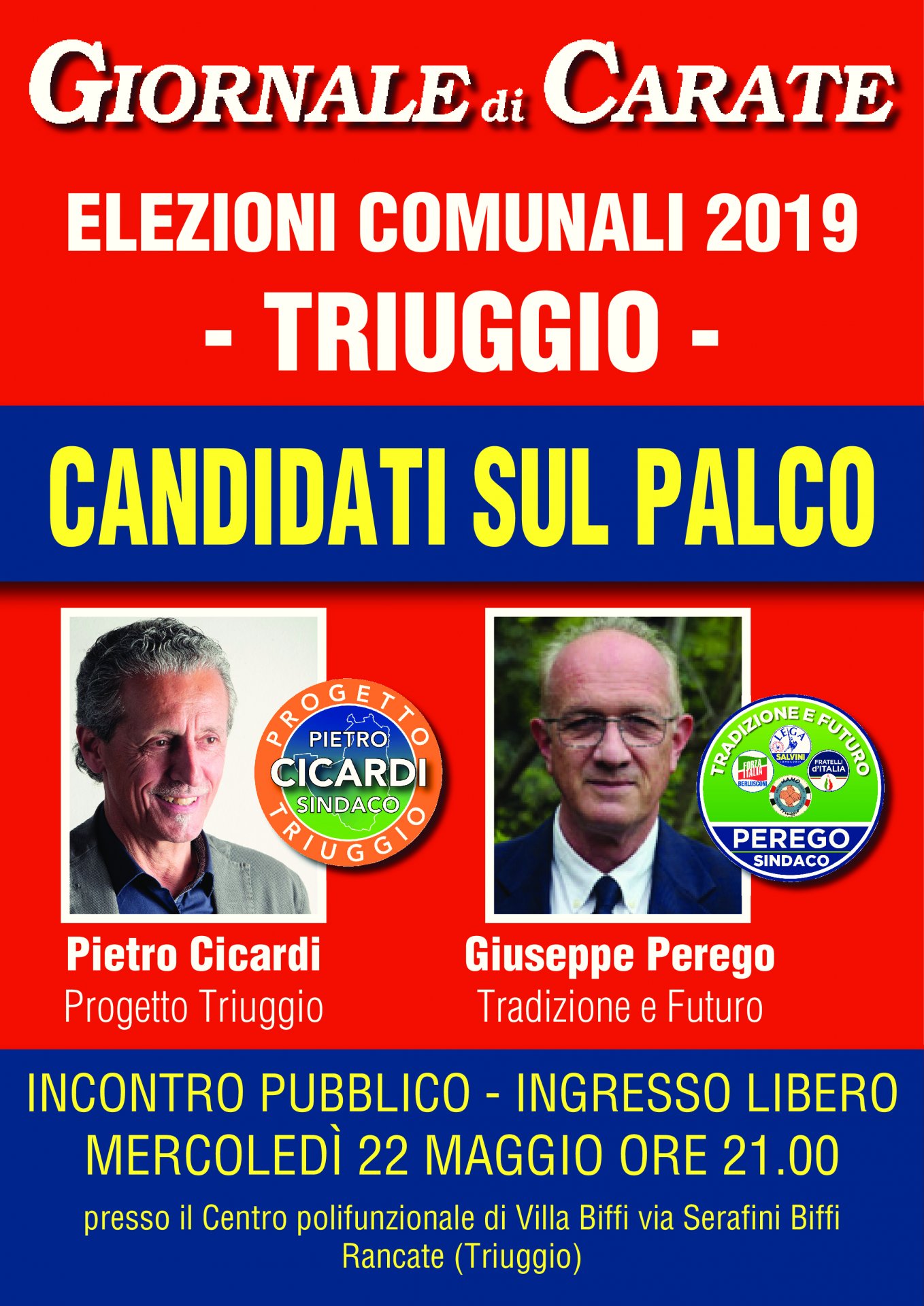 Volete conoscere da vicino i candidati sindaci di Triuggio e il loro programmi? Volete porgere loro una domanda? Allora non perdetevi l’incontro organizzato dal Giornale di Carate per domani, mercoledì 22 maggio. Protagonisti saranno Giuseppe Perego (Tradizione e Futuro), candidato sindaco di centrodestra, e Pietro Giovanni Cicardi (Progetto Triuggio) sindaco uscente della coalizione di centrosinistra.
