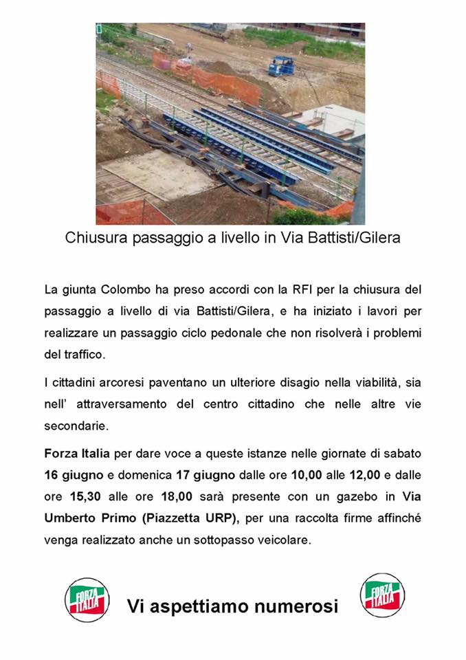 “Se anche tu ritieni assurda la decisione del Comune di Arcore di chiudere il passaggio a livello di via Battisti/Gilera, ti aspettiamo sabato e domenica in piazza per firmare affinché sia realizzato anche un sottopassaggio veicolare”, ha sottolineato il capogruppo forzista Cristiano Puglisi