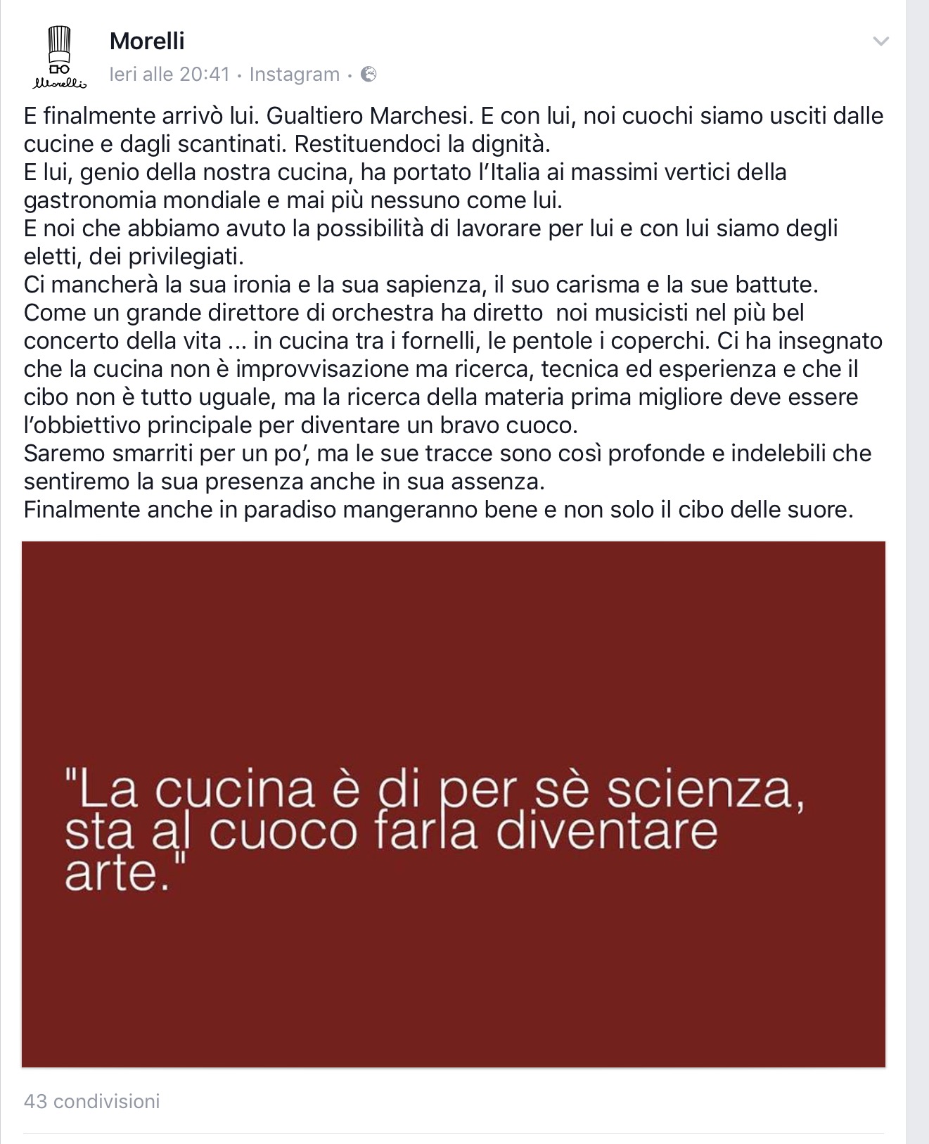 A poche ore dalla scomparsa di Gualtiero Marchesi, Giancarlo Morelli dedica a lui un lungo post su Facebook.