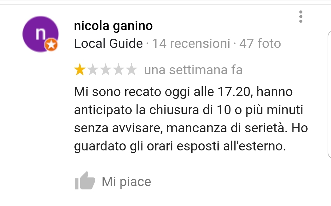 “Mi sono recato oggi alle 17.20, hanno anticipato la chiusura di 10 o più minuti senza avvisare, mancanza di serietà. Ho guardato gli orari esposti all’esterno”, ha scritto Ganino