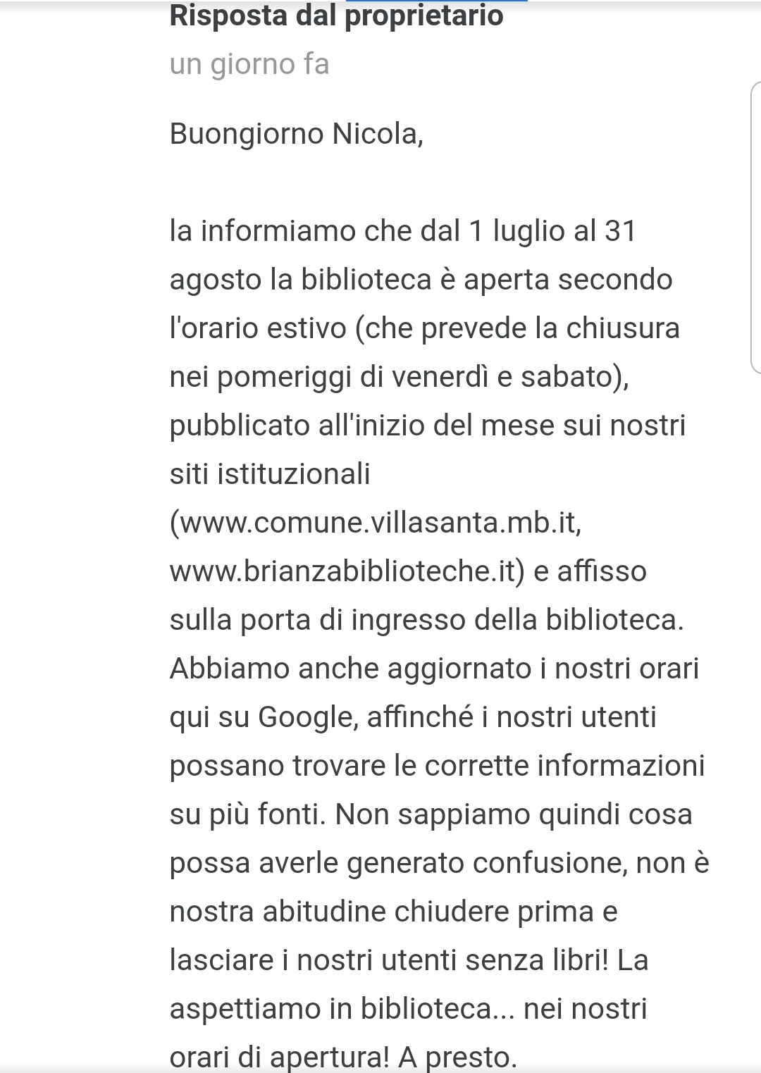 “Buongiorno Nicola, la informiamo che dal 1 luglio al 31 agosto la biblioteca è aperta secondo l’orario estivo (che prevede la chiusura nei pomeriggi di venerdì e sabato), pubblicato all’inizio del mese sui nostri siti istituzionali (www.comune.villasanta.mb.it, www.brianzabiblioteche.it) e affisso sulla porta di ingresso della biblioteca. Abbiamo anche aggiornato i nostri orari qui su Google, affinché i nostri utenti possano trovare le corrette informazioni su più fonti. Non sappiamo quindi cosa possa averle generato confusione, non è nostra abitudine chiudere prima e lasciare i nostri utenti senza libri! La aspettiamo in biblioteca… nei nostri orari di apertura! A presto.”